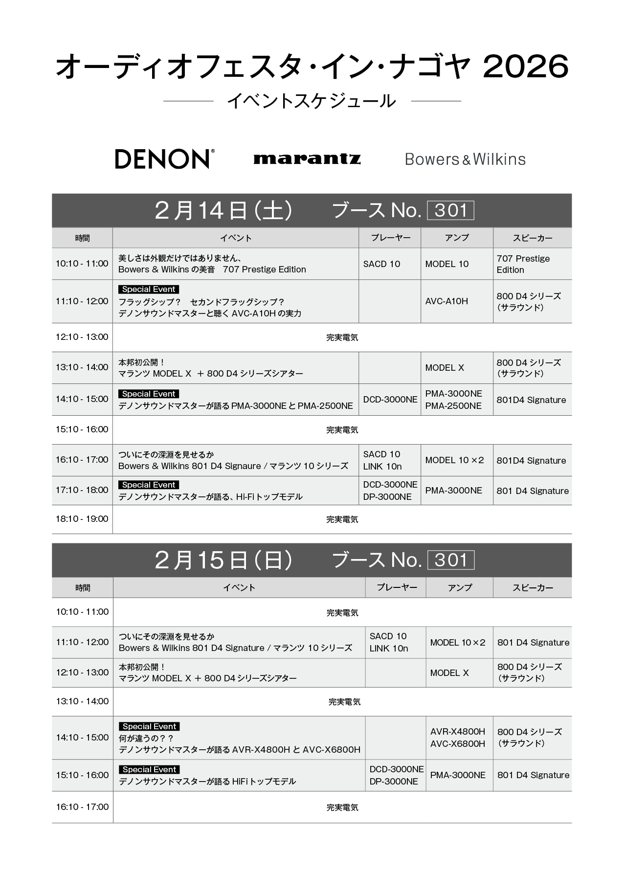 2026年2月14(土)~15(日)に開催される名古屋地区最大のAV イベント「オーディオフェスタ・イン・ナゴヤ」で行われる取り扱いブランドのデモスケジュールを確認ください。